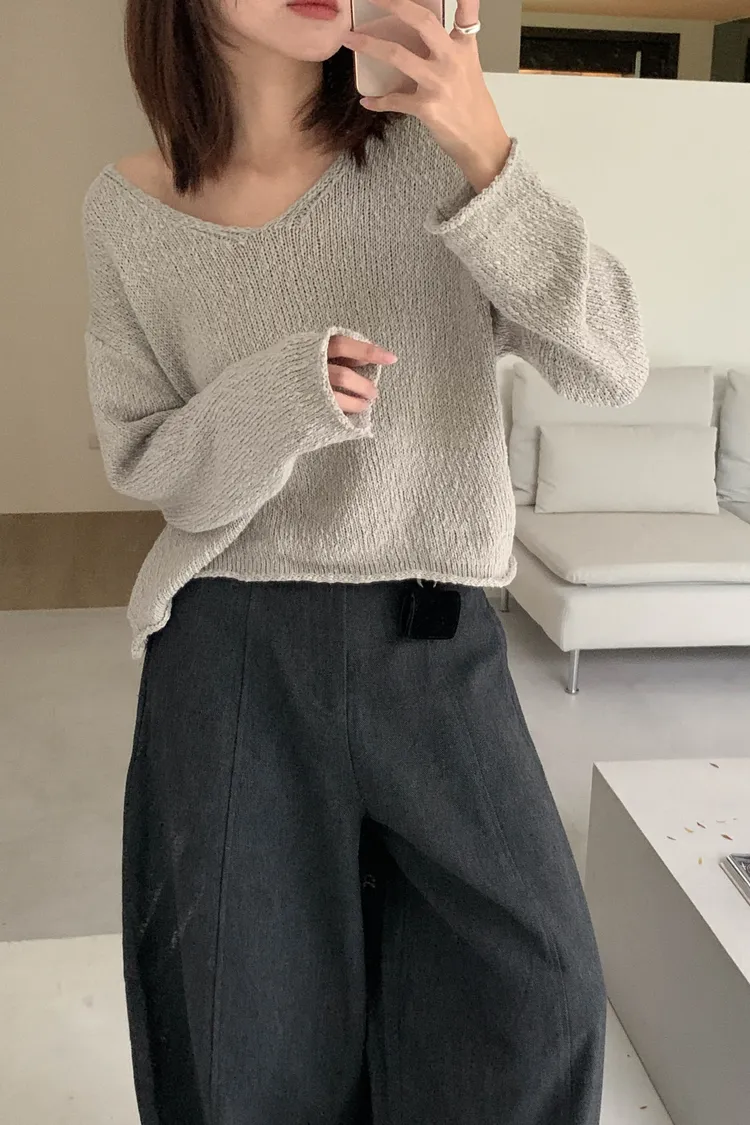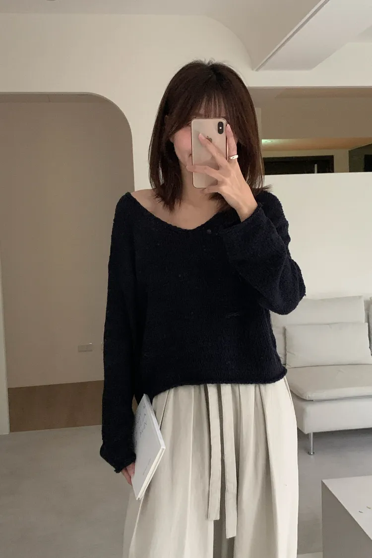 寬V領剪裁柔和凸顯鎖骨線條