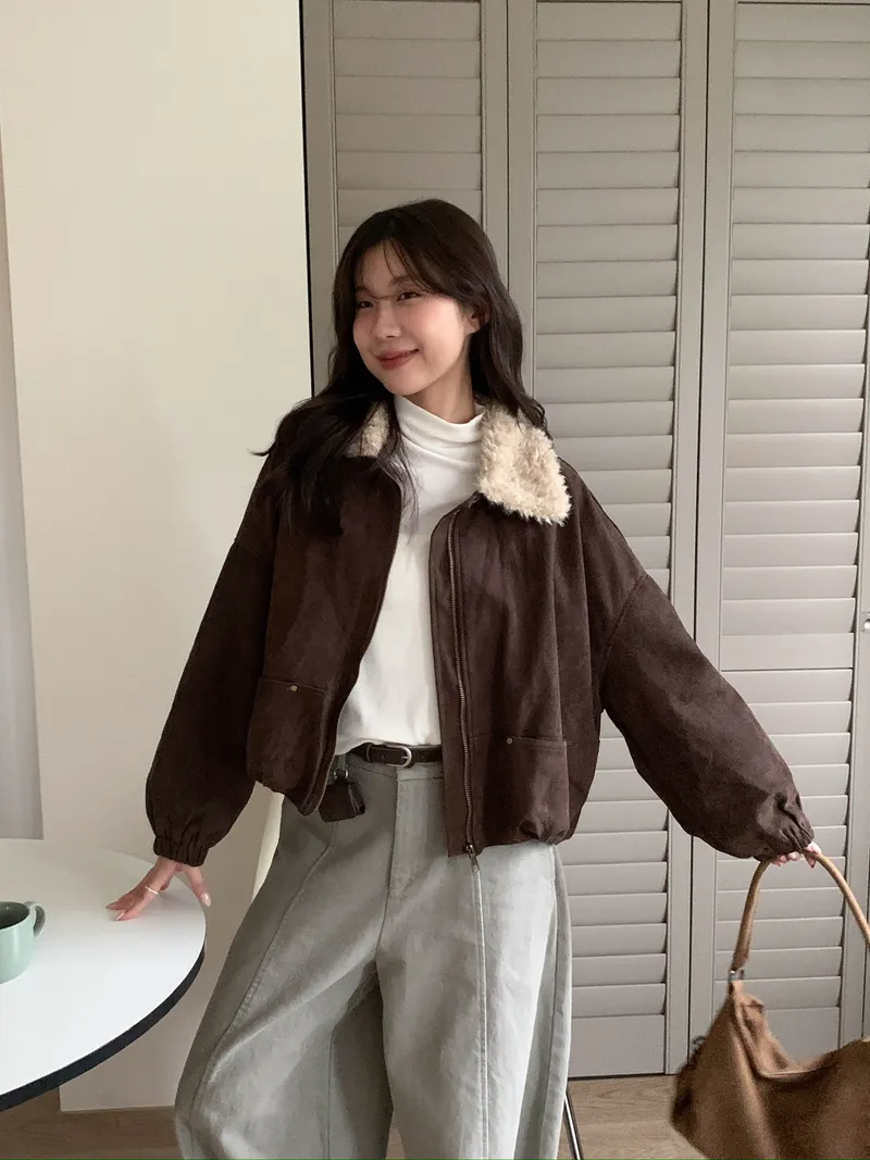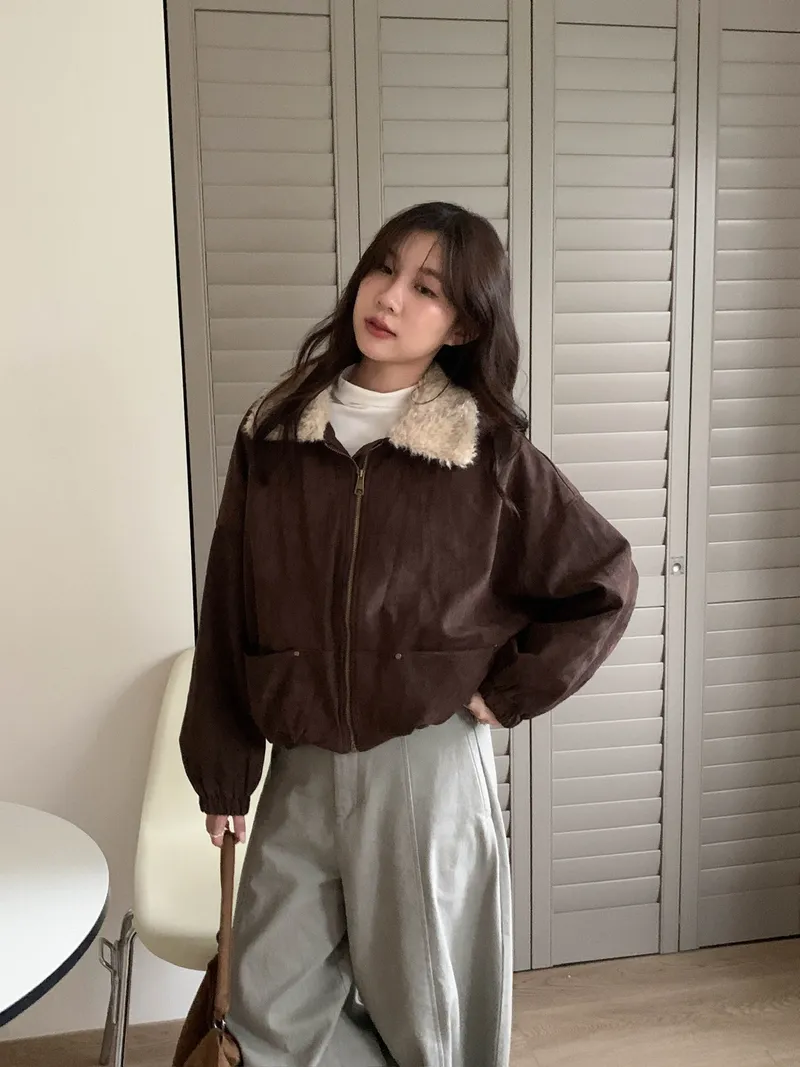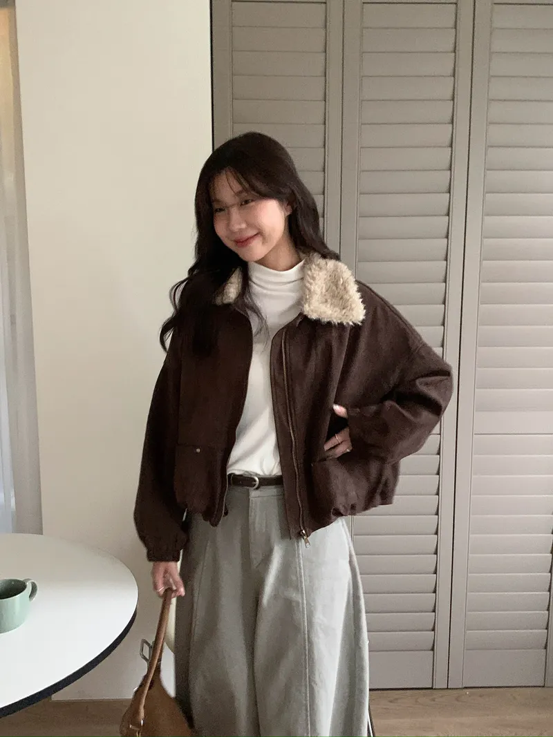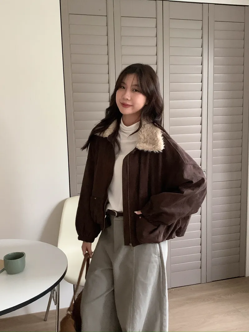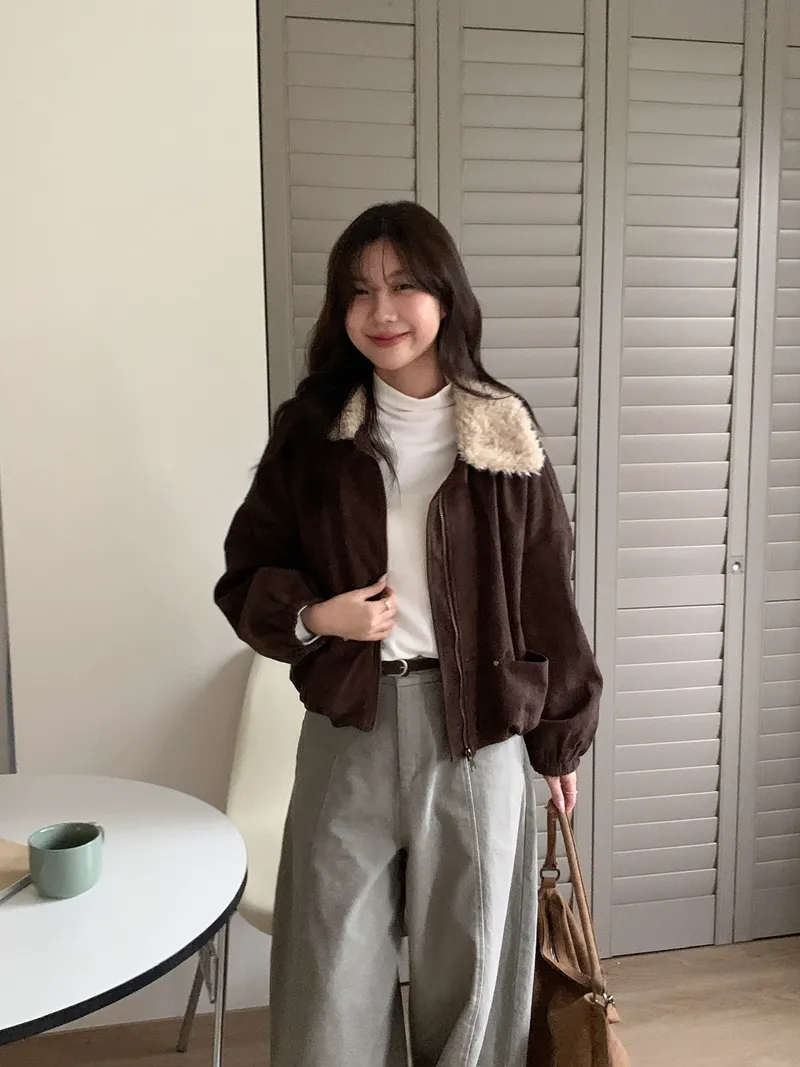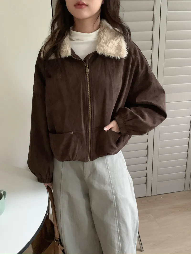絨毛拼接領很可愛 搭配復古五金拉鍊