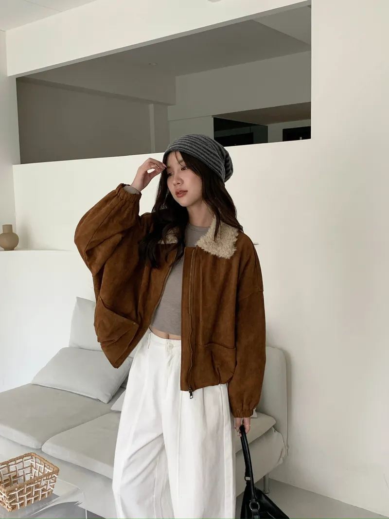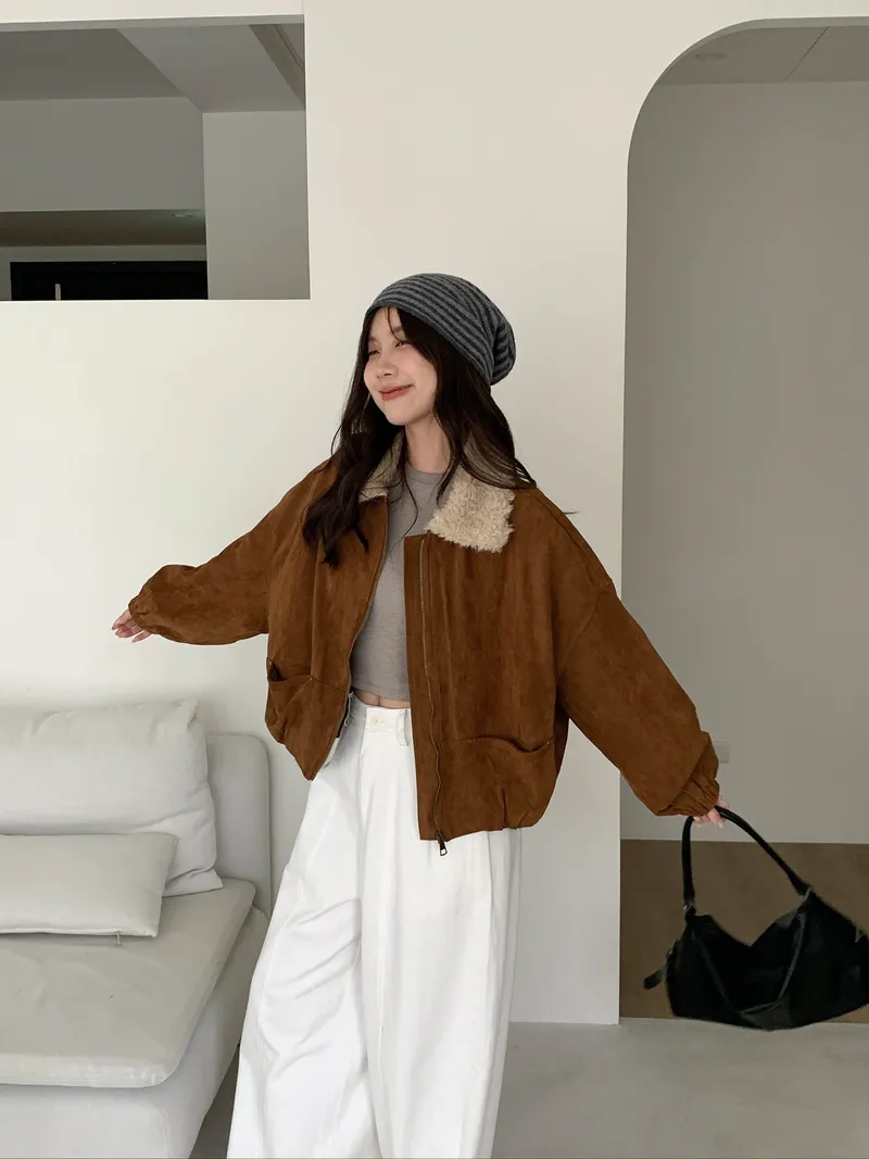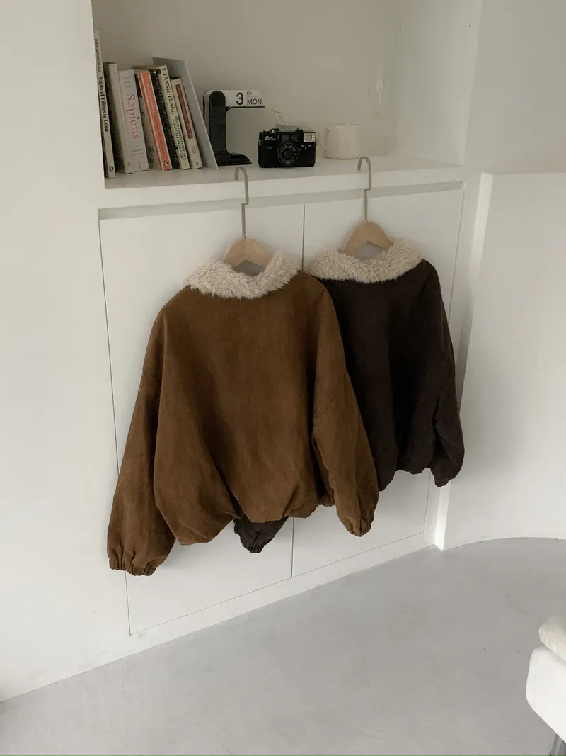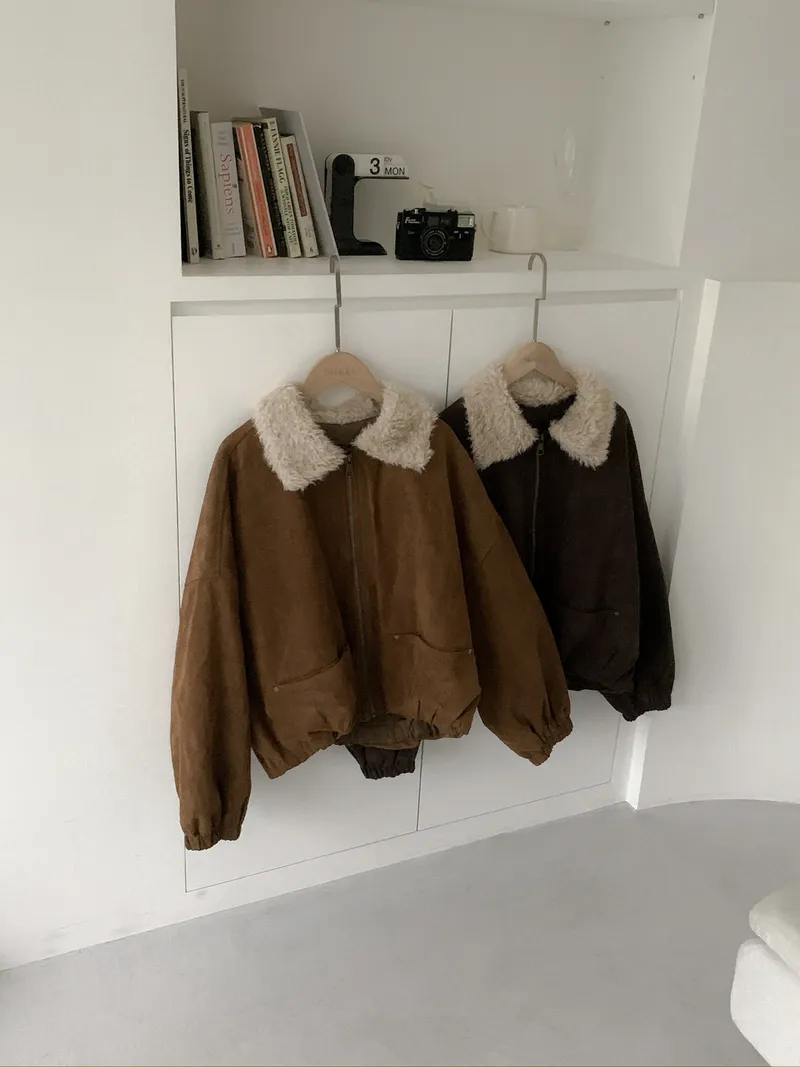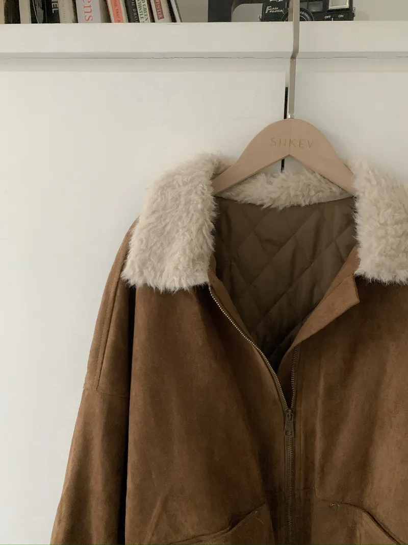 絨毛拼接領很可愛 搭配復古五金拉鍊