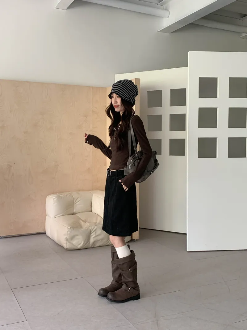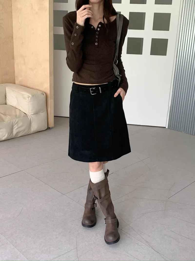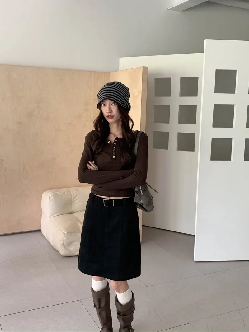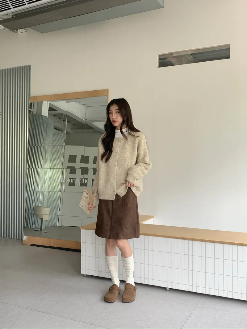 此款著腰圍合身舒適,臀以下寬鬆有空間,長度約在膝蓋上一個手掌