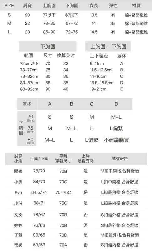 | L | 34.5/35/36 | 31.5/32/33.5 | 14.5 | 有 | 棉+聚酯纖維 |